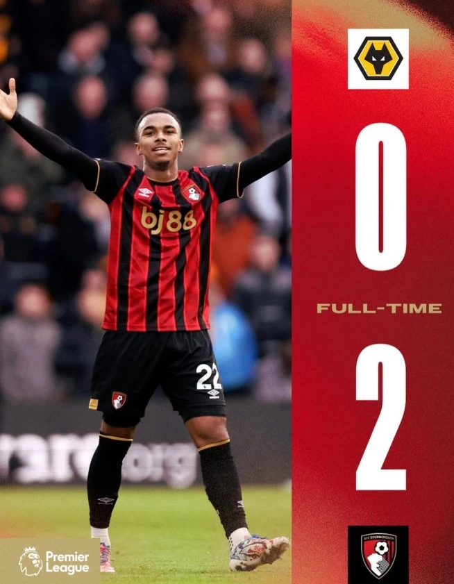 Bournemouth berhasil meraih kemenangan penting saat bertandang ke markas Wolverhampton Wanderers dengan skor 2-0. Bermain disiplin dan penuh efektivitas, Bournemouth mampu mengontrol jalannya pertandingan dan memanfaatkan peluang dengan sangat baik, sementara Wolverhampton kesulitan menembus pertahanan rapat tim tamu.